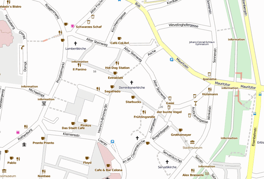 In der näheren Umgebung befinden sich bekannte Sehenswürdigkeiten wie etwa Haus der Niederlande, St. Lamberti und Dominikanerkirche . Interessant sind diese Landkarten: Promenade , Historisches Rathaus Münster, St.-Paulus-Dom und St. Lamberti